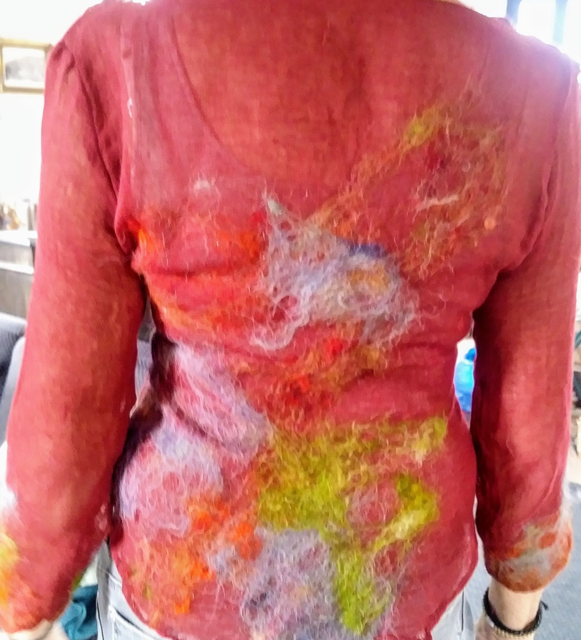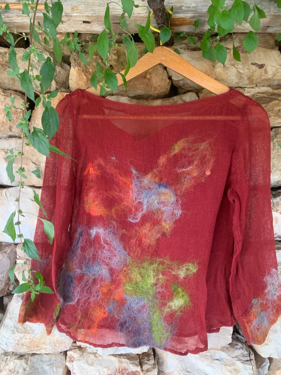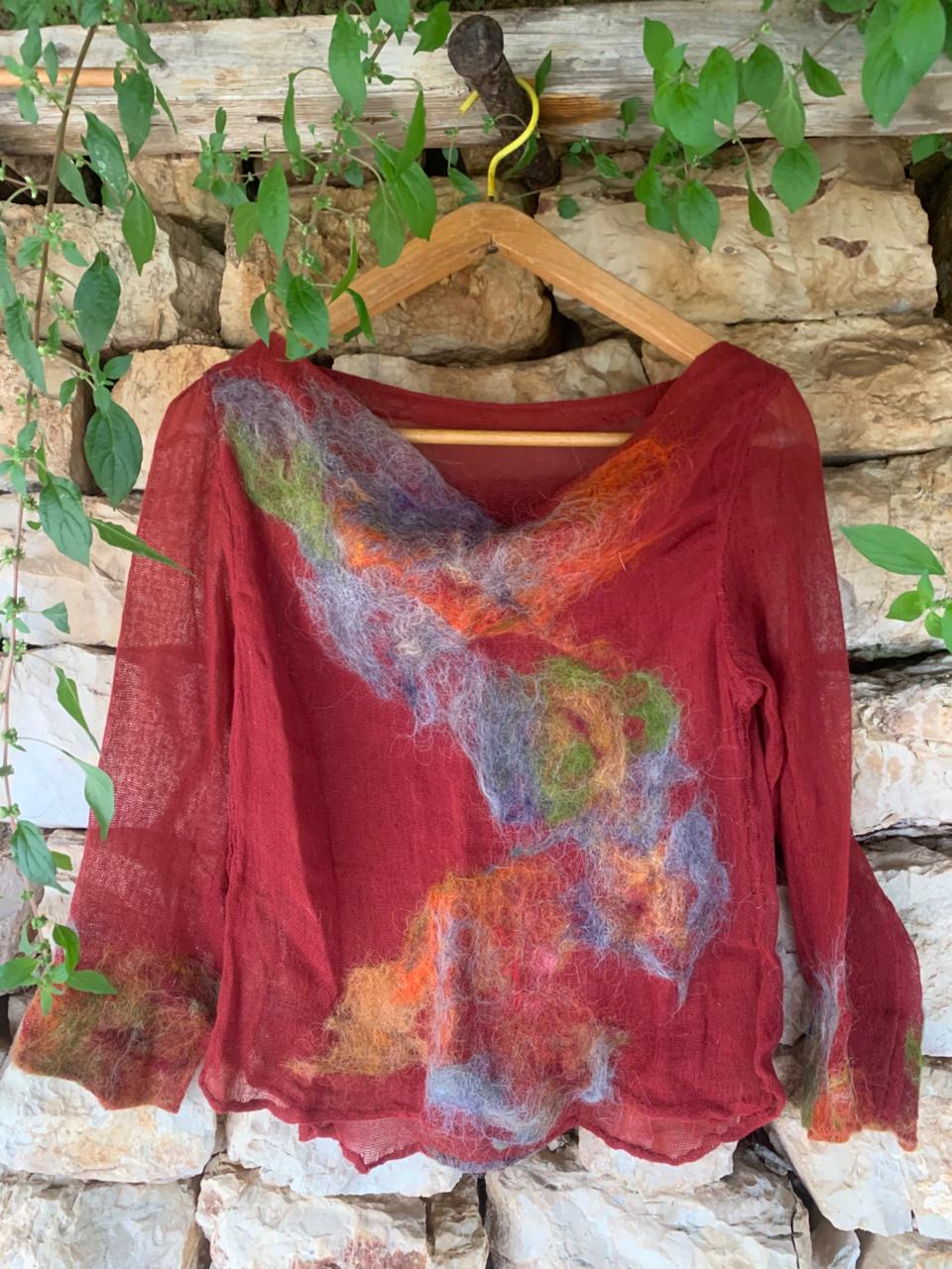 A vibrant fitted blouse, felted with hand-processed raw wool