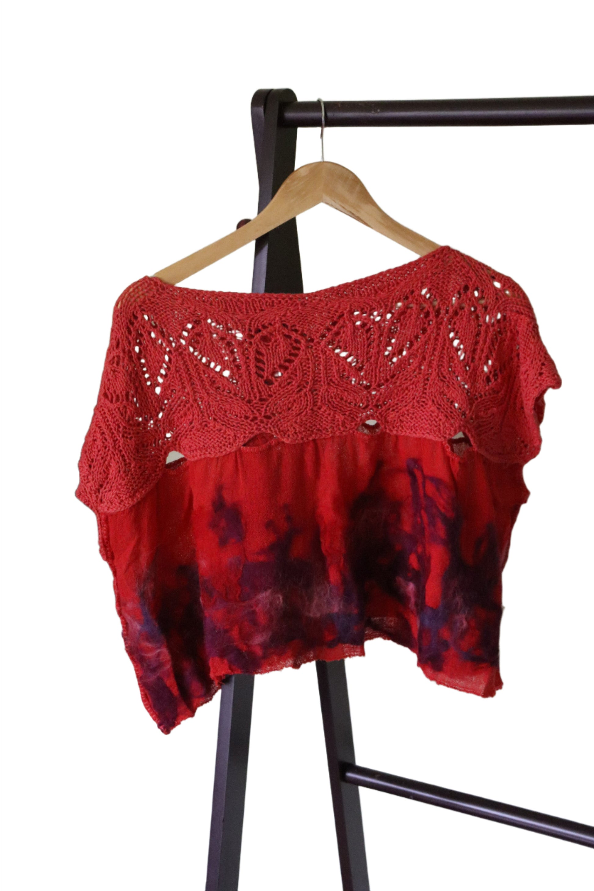 A short sleeve shirt of vibrant red and felted marbled reds and purples
