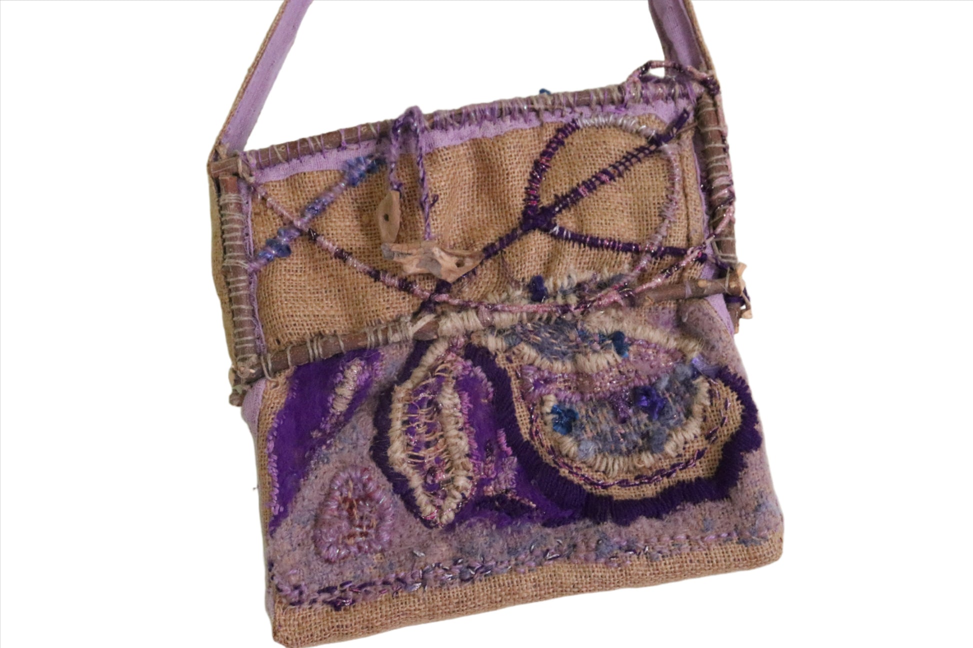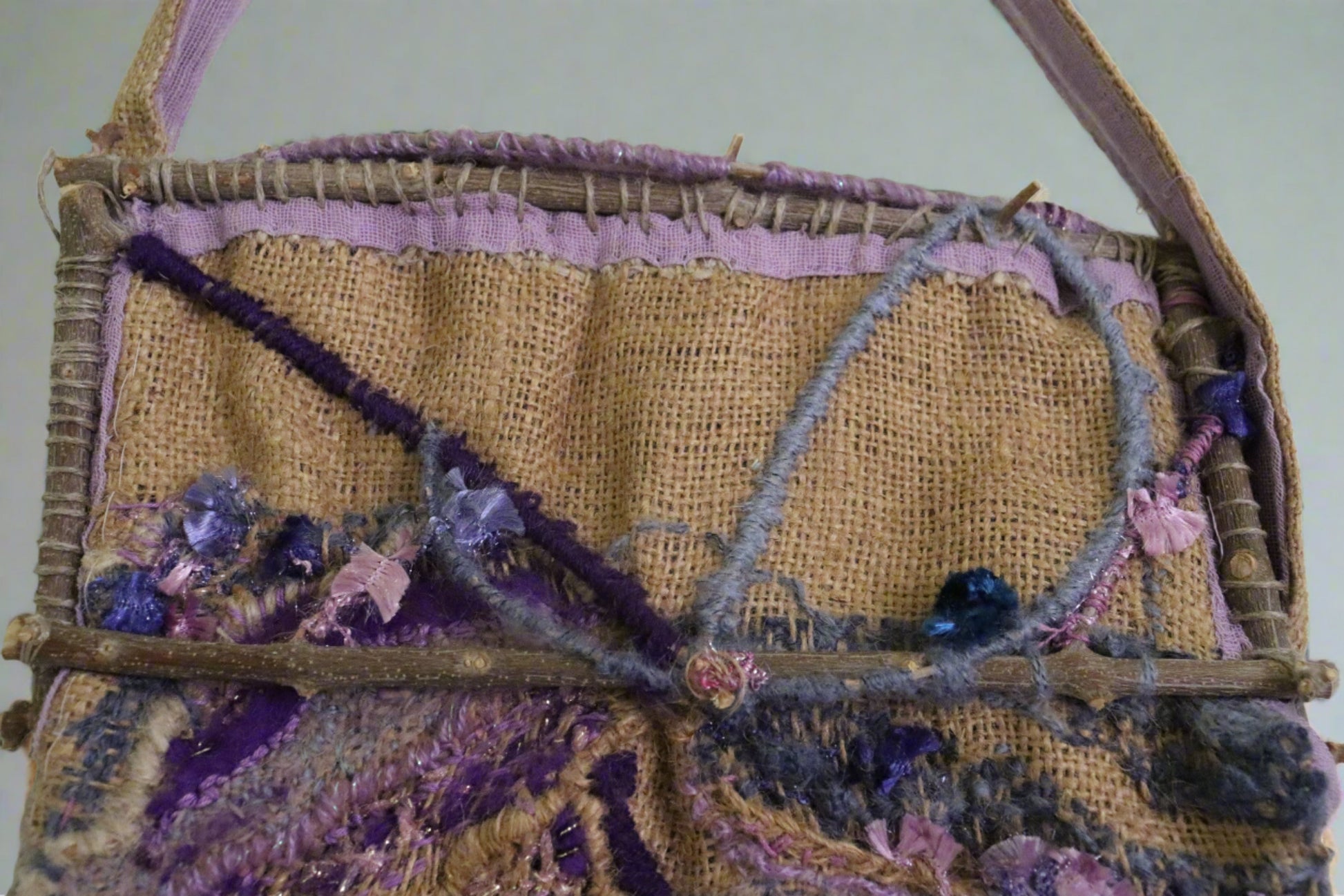 A shoulder bag of jute on a frame of olive tree branches